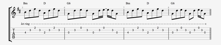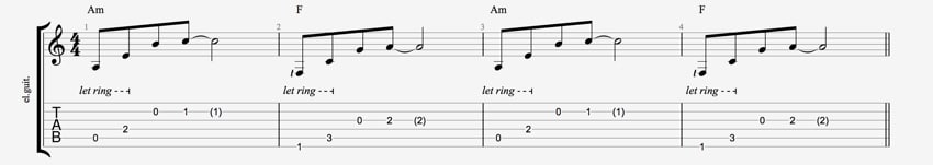 On enchaîne avec un arpège facile d’accès que vous pouvez jouer aux doigts ou au médiator. Les deux méthodes sont intéressantes à travailler pour développer votre technique.