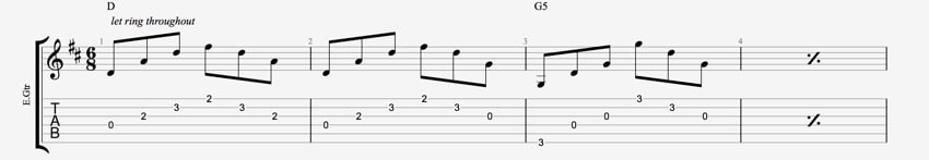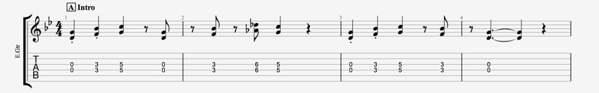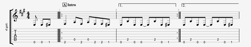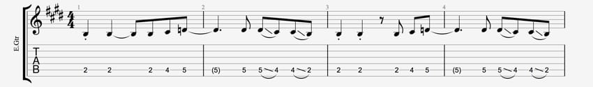 Le riff se joue avec des doigtés en quartes représentés sur la tablature ci-dessus et non pas avec des power chords traditionnels. Au niveau de la rythmique, pensez à jouer avec suffisamment d’intensité et à bien respecter les silences qui sont très importants dans ce riff.