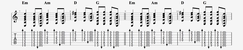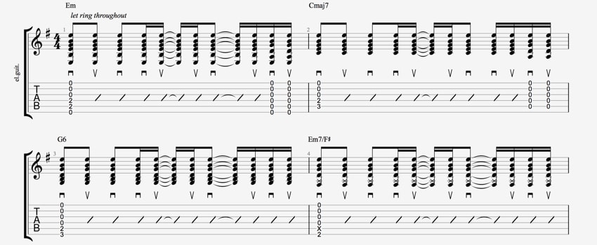 Deuxième arpège de cette sélection, EverybodyHurts est également très simple à jouer. Au lieu du 4/4 traditionnel, on joue ici en 6/8 (2 groupes de 3 croches par mesure).