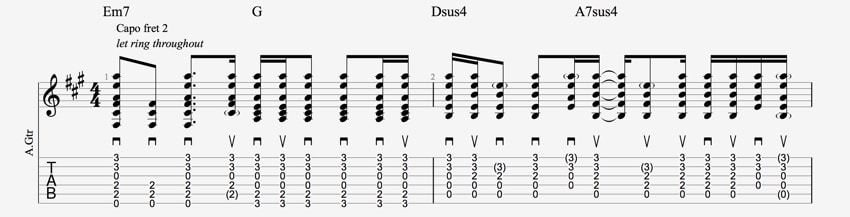 Vous pouvez jouer ce morceau à l’aide d’un capodastre en case 2 ou de manière traditionnelle. Dans les deux cas, ça sonne très bien !