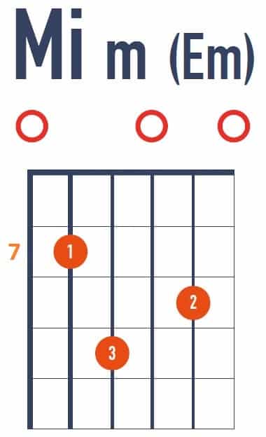 Nous pouvons transformer l’accord de Mi mineur en un bel accord ouvert à la 7ème case. La bonne nouvelle, c’est qu’il ne sagit pas d’un accord barré ! Il est donc facile à réaliser.
