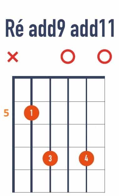 Pareil pour l’accord de Ré, sauf qu’ici notre accord va devenir un accord Ré add9 add11. Nous allons y ajouter deux notes pour cette nouvelle position, pour obtenir un accord de guitare facile à jouer car ce n’est pas un accord barré non plus.