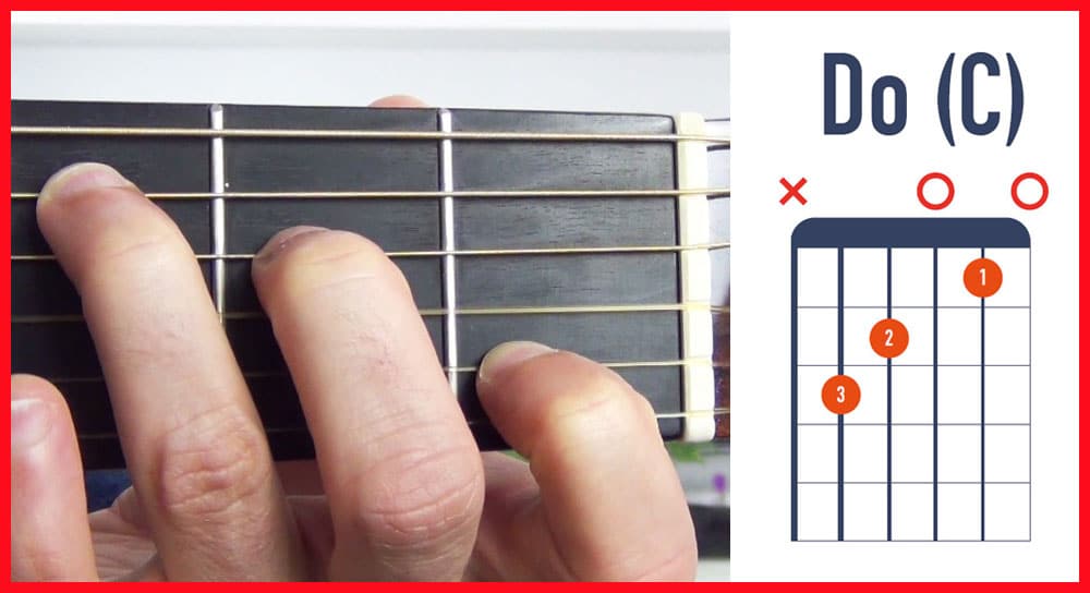 Et enfin l’accord de Do majeur, placez bien d’abord l’annulaire, puis le majeur et enfin l’index pour gagner du temps dans vos transitions de manière générale :