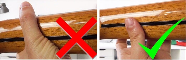 Ayez toujours votre pouce bien à plat de l’autre coté du manche, à peu près au milieu du manche de la guitare, en pliant bien votre poignet.