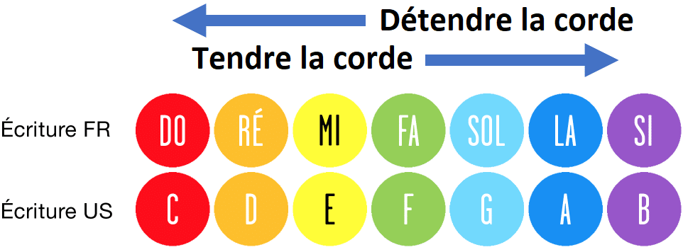 Pour éviter cela, si la corde vous parait anormalement trop basse ou trop aiguë, vous avez peut-être tourné la mécanique dans le mauvais sens. Suivez votre instinct ! Bientôt cela vous paraîtra évident.