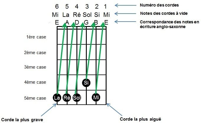 - Mi (E) : 6ème corde (la corde la plus grave)