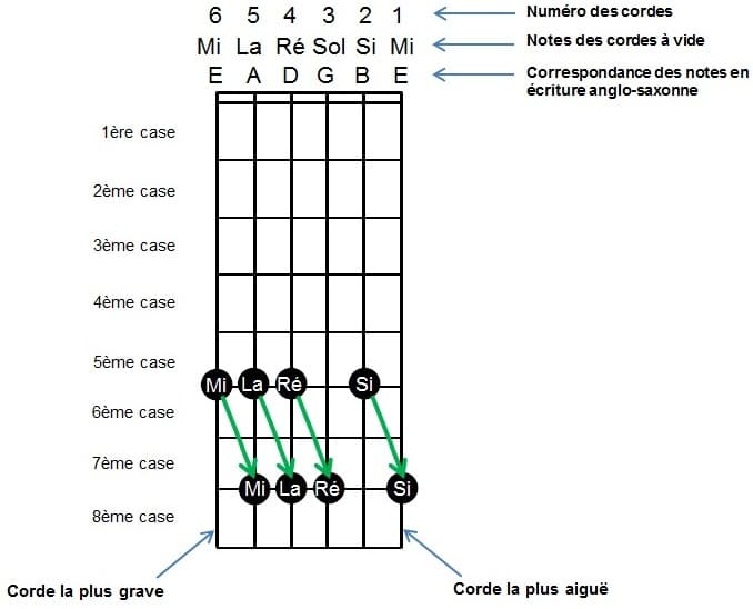 - A la 5ème case de la 2ème se trouve la note Mi, qui correspond à la 1ère corde à vide