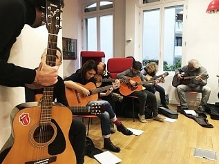 4/ Quels sont les cours possibles ? Alors la méthode de guitare que nous avons mis au point est pour les vrais ou faux débutants en guitare, elle se décline en 2 possibilités : soit le stage de guitare en 3 jours, c’est 3 samedis de suite, 3 journées entières, on est en groupe, les participants n’ont jamais touché une guitare ou presque, et l’idée c’est d’avoir une formule coup de boost pour avoir les bases pratiques et théories à la guitare en seulement 3 jours. En 3 jours de stage, déjà on comprend mieux l’instrument, on prend les bonnes habitudes, on peut jouer quelque chose de sympa à la fin et surtout on peut en toute autonomie continuer d’apprendre la guitare par la suite. C’est le plus important dans une bonne méthode de guitare, l’autonomie pour moi c’est capital. Ensuite on a la possibilité de faire le programme équivalent, mais avec un cours de guitare en ligne, c’est à dire un cours de guitare en vidéo de chez soi, à son rythme, quand vous voulez, même en pyjama si vous voulez c’est vous qui voyez. Alors là ce n’est pas en 3 jours, l’idée ici a été de s’adapter au rythme de nombreuses personnes qui soit n’ont pas envie d’un cours à l’année ou alors qui n’ont pas le temps tout simplement. A son rythme, de chez soi, on a eu aussi déjà pas mal de participants, c’est interactif aussi on est là pour répondre aux questions, accompagner les élèves dès le début.