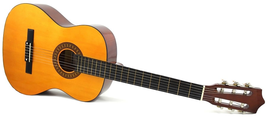 Une guitare classique a six cordes dont les 3 aiguës sont en nylon et les 3 cordes graves sont en nylon filé avec du métal. Le manche donne accès à 12 cases hors du corps de la guitare. La guitare classique est souvent aussi appelée « guitare sèche » ou aussi « guitare espagnole ».